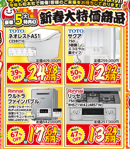 このように、一流メーカーの設備を驚きの初売り価格でご提供!