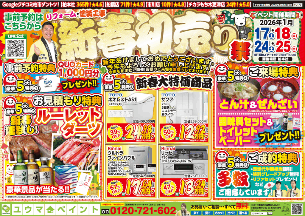 新年あけましておめでとうございます!ユウマペイントです。 地域の皆様への感謝を込めて、今年も恒例の「新春初売り祭」を柏本社にて開催いたします!