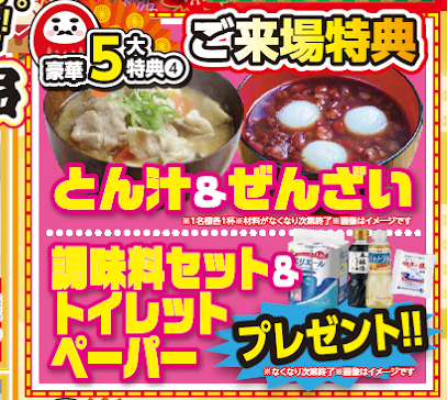【ご来場特典】心もお腹もポカポカに アツアツのとん汁&ぜんざいでおもてなし!さらに、調味料セットやトイレットペーパーのプレゼントもご用意しています。